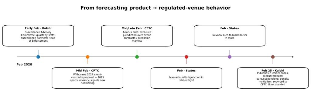 Kalshi’s February 2026 timeline shows the platform’s transition from forecasting product to regulated venue through surveillance infrastructure, CFTC jurisdiction claims, state legal challenges, and public insider-case disclosures.